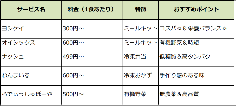 🔹 ヨシケイ(1食300円台~、栄養バランス◎)→詳細はこちら
