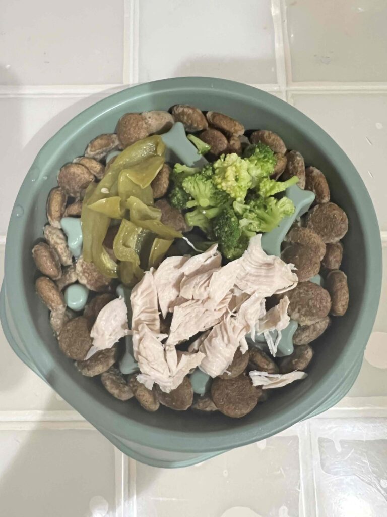 香りが立ち、消化も優しくなります。 - 茹でたささみや野菜を少量トッピング (写真はピーマンとブロッコリーとササミ)
